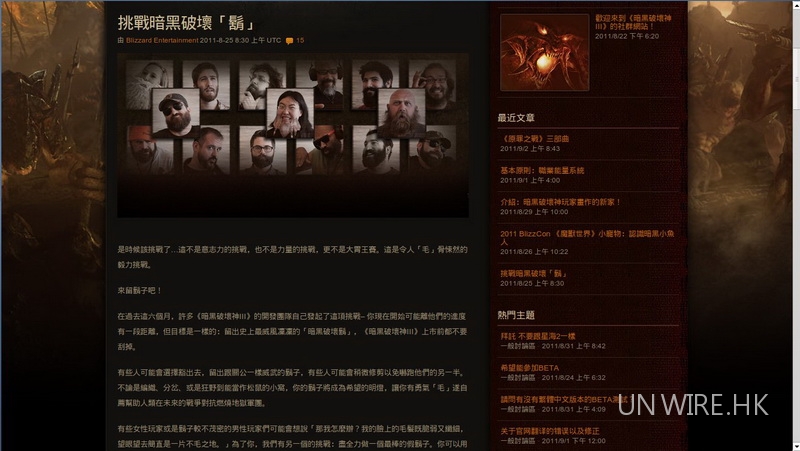 要取得 Diablo 3 封測資格,玩家除了透過 Blizzard 一貫的「正規」方法—靠閣下 Battle.net 帳號的 Beta Profile「等運到」之外,今次Blizzard亦會和不同的合作媒體和粉絲網站發放1000個封測帳號,其中Battle.net就別開生面地舉辦了一項名為「挑戰暗黑破壞『鬍』」的活動,玩家只要把自己留有鬍子(或假鬍子)的相片寄到tw-community@blizzard.com便有機會獲得封測帳號一個,不過千萬粉絲爭5個帳號,我想能獲得暗黑破壞神垂青的鬍子必定是很壯觀。