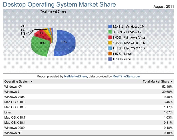 操作系統每次有新一代推出,正常都要花點時間才能普及起來。今次Mac OSX 10.7 Lion,推出已有一個月,成績看來也不錯,現在已有1.03%的PC系統佔有率,正慢慢追上前兩代的OSX 10.5 Leopard,而在Mac OSX之中,Snow Leopard依然有最高的佔有率。