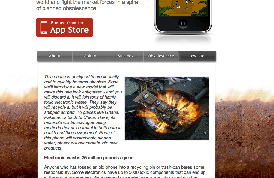 一款原意是教育大家在購買自己喜歡的智能手機時,背後要面對對環境的傷害與背後工人的辛酸的 iPhone 小遊戲《Phone Story》,於上架後數小時內就被抽下架,理由是遊戲中涉及了暴力元素。相信是因為其中一個小遊戲要救援於工廠天台跳下的工人,但最有趣不是被抽起,而是當初竟然通過審核。 [caption id="attachment_65972" align="aligncenter" width="580" caption="Phone Story 網站中詳細講解了這個生態鏈"][/caption] Phone Story 網站 http://phonestory.org