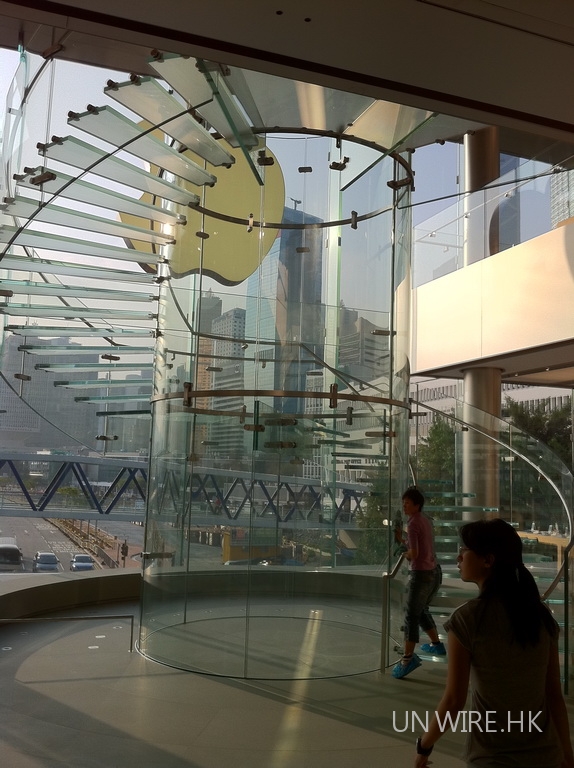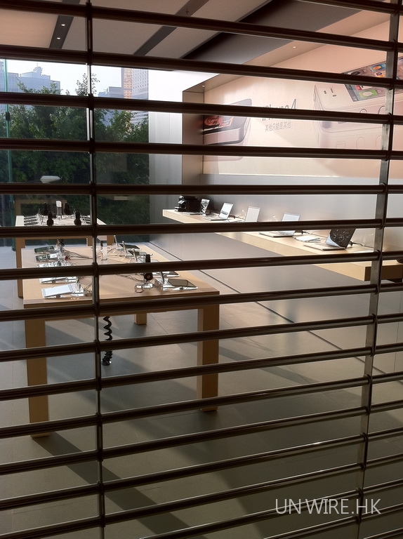 香港首家官方的 Apple Store,昨晚玻璃幕端已經解封。所以今早有日光出現時,我們就可以從商場內部位置看到 Apple Store 的店內情況,而可以發現產品已經就位了。內部使用的都是跟其他國家風格一致的簡約裝潢,一張張木枱排出產品,產品間有足夠的相隔,讓消費者可以舒適的試用。而值得一提的是,香港 Apple Store 也有經典的玻璃圓柱樓梯設計,不過是微縮版本。而這部分是店外,所以公眾已經可以駐足沾沾 Apple 的靈氣,或合照留影一下。