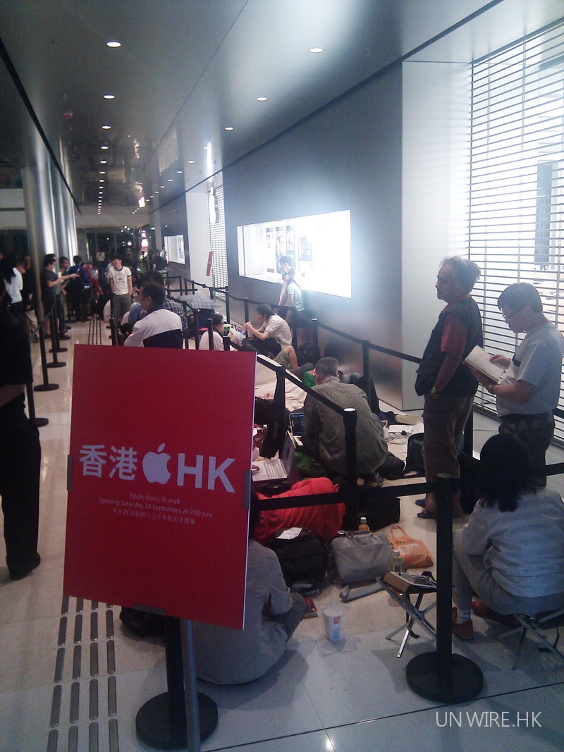 明日 9 時開幕的 IFC Apple Store,昨日起就有人排隊了。而進入了開幕前一晚,愈來愈多加入隊伍。相信不少人之前是駐足商戶中,現因為食店及其他商戶都紛紛關門,隊伍由一小時 60 人,激增至 120 多人。有其他商戶趁機宣傳,亦有人以為有新產品推出。 Starbucks 做通宵補充劑 除了 Smartone 會送蘋果批之外,大玩美式文化的 Starbucks 都會支持,IFC 店今晚會通宵營業,跟排隊 Fans 一同作戰。如果不想睡覺的,可以到時買一杯香濃咖啡提神。蒲完蘭桂坊的,也可以到時到場嘆咖啡參與盛事。 有人以為有 iPhone 5 駐場記者與友人亦有排隊,大約 60 多位的位置。在與前方的南亞藉人士閒談時,原來他一直以為明天會賣 iPhone 5,知道明天沒新機後,3 秒鐘走人,相信是炒賣投機人士。