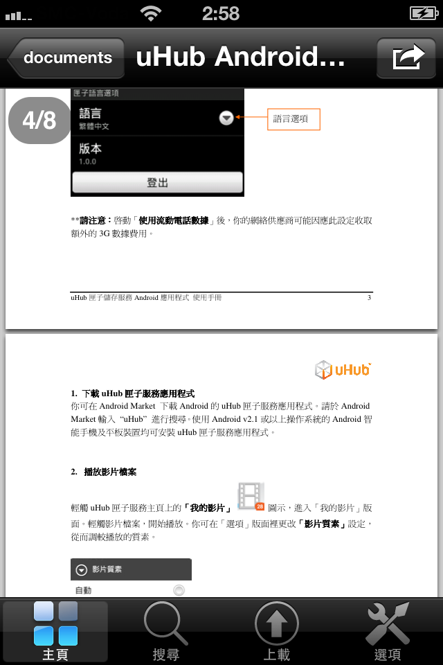 uHub能夠在 iPhone、Android 手機、平板電腦或PC等不同平台上使用,這一點也是令我很欣賞的地方。登入uHub後,會發現主介面已將音樂、相片、影片及其他檔案分類儲存,管理上方便容易。即使由 iPhone 4轉用 Galaxy S II,或想過片到Galaxy Tab 10.1上播放,也不用大費周章去「同步」備份,然後左抄右抄將檔案「過戶」到另一平台上,可以直接經由uHub的雲端伺服器存取,簡直是我這類經常追新款流動裝置的人的一大喜訊。