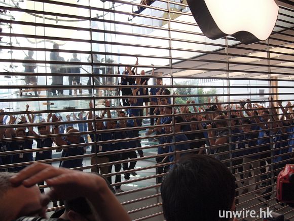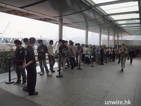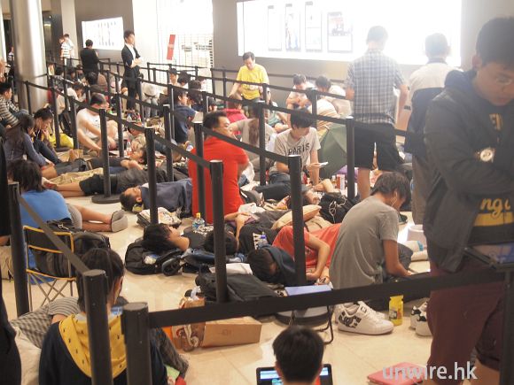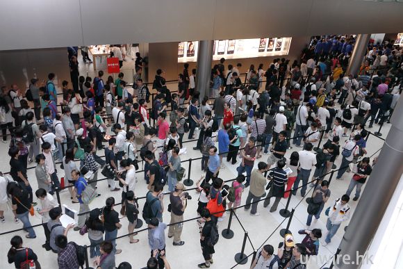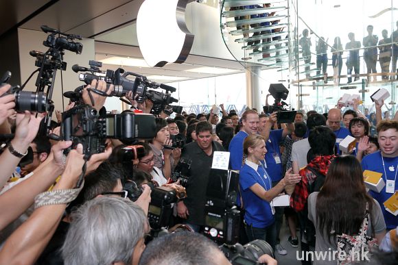 通宵排隊的 Fans,在晨光初現時很多都依然未起身。早上人潮開始爆發,商場排隊「打蛇餅」。排至門外,相當誇張。未開門時,內裏員工已經不斷大呼 Apple 口號。準備開張的員工個個情緒高漲。如果見唔到 Apple 職員,場面係同等大明星落機一樣。記者就算貼個 Apple 標誌,門口護衛仍不肯讓香港傳媒先進場,理由是:「別人通宵在等,怎可能讓你們先進去!」,就連有線、亞視及幾間大電視台都在我們前面無法進內,反為有幾位外國傳媒記者可以先進場,令香港媒傳十分不滿,還有人傳出種族岐視的投訴
