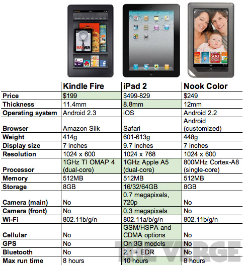 把Kindle Fire、iPad 2和Kindle Fire的直接競爭對手:Nook Color拍在一起比較,不難發現原來Kindle Fire的硬件配備,跟iPad 2差不多,而Nook Color更是完敗。最厲害的是Kindle Fire的價格非常便宜,比Nook Color還便宜50美元,雖然Kindle Fire的系統,是Amazon改裝過的Android,但想也知道,Cyanogen Mod的高手們,已經準備好要把它變成另一部抵玩的Android Tablet了。