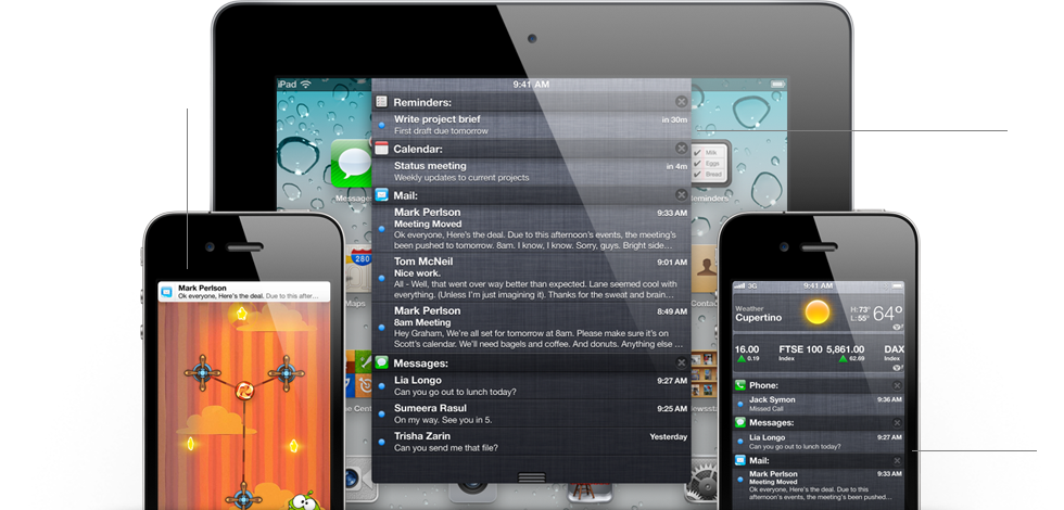 iOS 自發展以來,一直加入用戶所訴求或對手的有用功能,繼 Push Notification 之後,iOS 5 會有如 Android 式的通知功能。該功能將系統所有程式的通知集中於上方通知的下拉式頁面。當有新短信或其他程式的通知時,都會顯示提示,但只維持一會就消失,將對用家的干擾不大。當用戶下拉通知列時,就會細分各個程式的提升,以及用戶自訂如:股票、天氣等特定資訊。