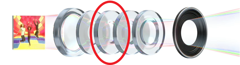 除了感光元件與像素的不同,新 iPhone 的鏡頭模組加入了第 5 鏡片,採取 Hybrid IR + 5 鏡片採光,使到光圈可以大增至 f/2.4,新鏡頭系統使相片的銳利度大增 3 成,使輸出效果達相機級數。