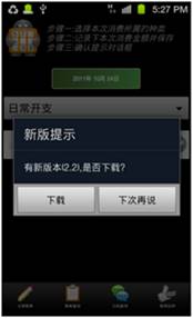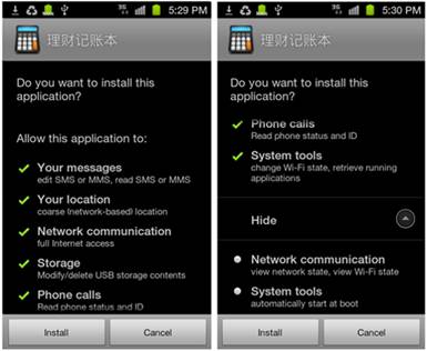 今天 F-Secure 發現的,是一個稱為「理財記賬本」的軟件的「加料」版。「理財記賬本」之前在官方 Android Market 上供人下載了一段時間,而今天這軟件利用「軟件更新」渠道,將用戶原有的「無毒」版「理財記賬本」加料變成有毒間諜軟件。新的加料版「理財記賬本」雖然已經不再存放於 Android Market,但我們仍然在一些中國的網站發現這軟件: