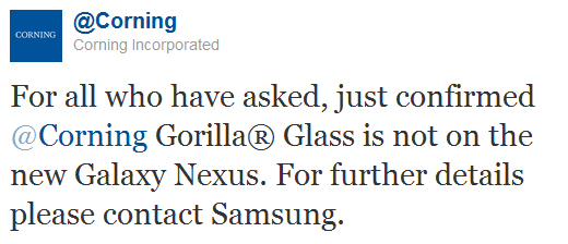 在一段時間之前,有些資料稱Galaxy Nexus用上了Corning的Gorilla強化玻璃,不過最近Corning方面澄清,Galaxy Nexus並沒有採用Gorilla強化玻璃,而Samsung方面的資料亦指,它是採用了強化玻璃表面,但沒有表明是來自哪家廠商。
