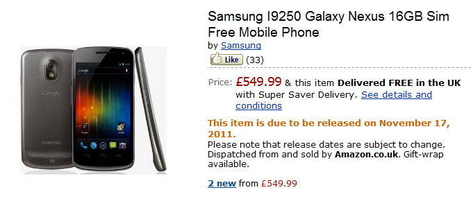萬眾期望的 Samsung Galaxy Nexus 智能手機,於英國 Amazon 上已經開發預售,而且更有正式推出日期,將於在 11 月 17 日出貨。該機售價為 549.99 英鎊,即高達港幣 $6877.35。但我們至少可以知道,如果想擁有的話,大可以儲錢於當日預備購買水貨。