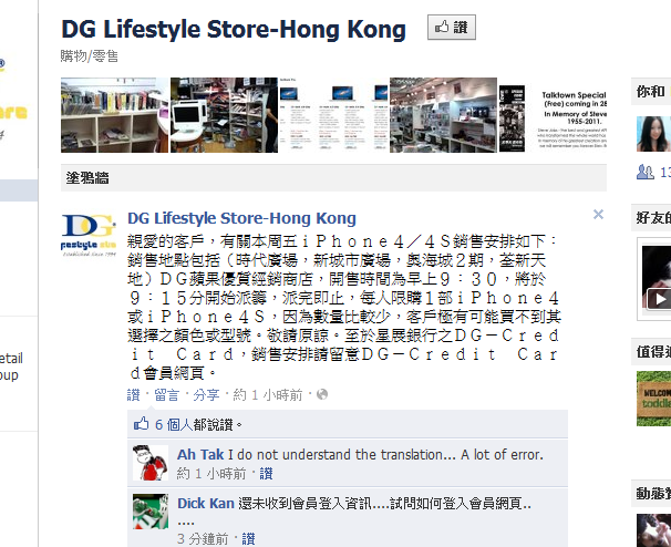 除了上台出機,或者到 Apple Store 排隊外,其實零售商也獲分貨。當中包括次次 Apple 新產品都有首賣的 DG Lifestyle Store。不久前就在其專頁內,發布了會有發售 iPhone 4S 的分店 (時代廣場,新城市廣場,奧海城2期,荃新天地)。店面 9 時 30 分開店,但會於 9 時 15 分開始派籌。不過他們亦有提到,今次的資量似乎有限,顧客未必可以選擇到心水顏色。