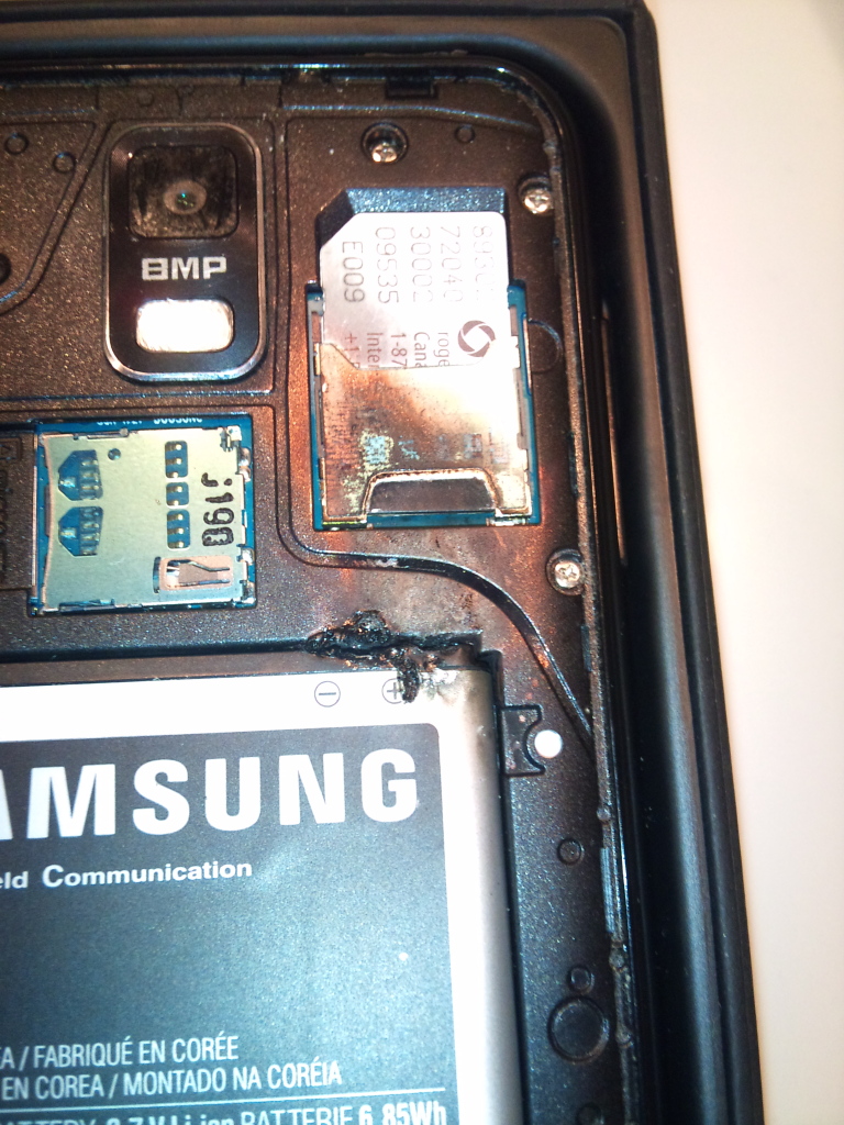 據xda-developer網友Silly22表示,險被炸傷小弟弟的朋友起初聽到褲袋傳來聲音,然後於腿間感到燃燒的熱力,朋友從褲袋取出所有物品,赫然見到待機中的Galaxy S II在冒煙。透過相片,可以見到電池和SIM卡位置燒至醺黑。