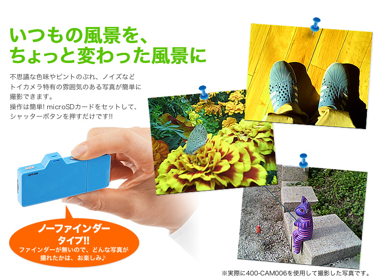 由於Mini Toy Camera太細少的緣故,並沒有LCD可供即時睇相,令用戶重拾從前菲林相機拍攝的感覺,相片和短片都存放在需另購的microSD卡內,透過USB連接電腦睇相和為相機充電。