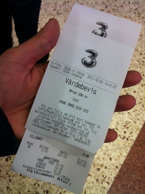 200Skr可無限上網30天,餘額會慢慢按用量扣掉,用完再充值,筆者一般能用35天。 早前iPhone 4S推出,為了八卦一下月費和機價,筆者都在網站留了資料,在開售前兩天,竟然收到電話,查詢是否有興趣買機上台,這是我從來未遇過最好的CS服務態度,有禮、解釋清楚,就算問完冇幫襯(留意iPhone 4S的機價就明白了,25%的銷售稅啊),亦依然客氣,全個電話對答接近20分鐘,沒有hard sell,令人舒服。