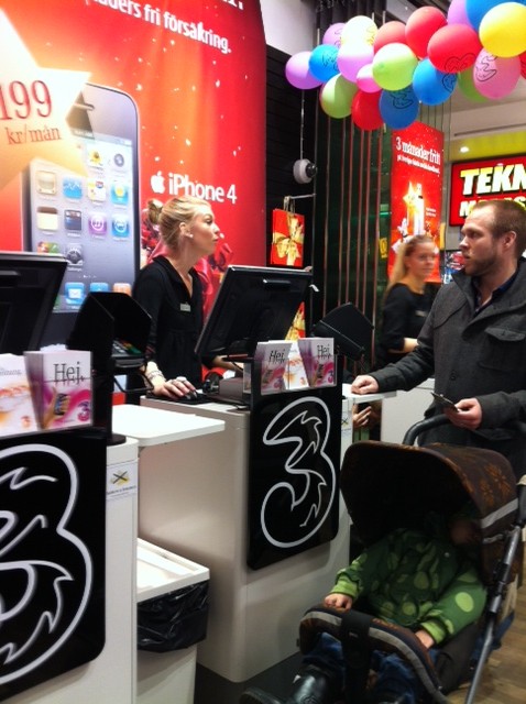 3Shop的手機模型一列排開,比起香港整齊企理一點。 可能工作壓力比較少,加上偶爾來個fika(coffee break),店員都從容一點。 iPhone 4S推出的那天,瑞典跟香港一樣,凌晨零時開賣,但員工都開開心心,與顧客邊飲邊吃小食,就像開party一樣,這個情境跟筆者從前在香港親身經歷和目睹的,簡直天與地。不知道有幾多3香港的前線員工是UNWIRE.HK讀者,看完上面一段,請不要太難過,你們有李氏力場庇佑,還是比較幸運的。