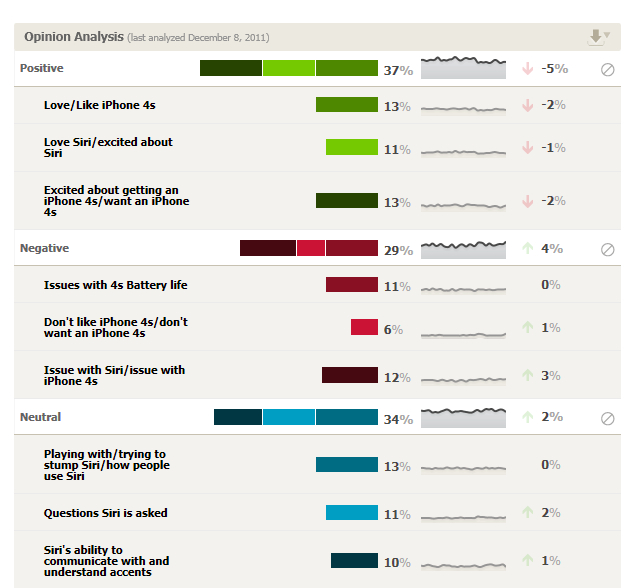 社交媒體分析機構Crimson Hexagon分析了Twitter內超過200萬條談及iPhone 4S的Tweet,分析當中正面、負面及中性的評價。而結果似乎並不十分正面,只有37%的tweet屬正評,負評達29%,而中性則佔34%,而相信蘋果最不願見到的,就是負評的數量上升中。