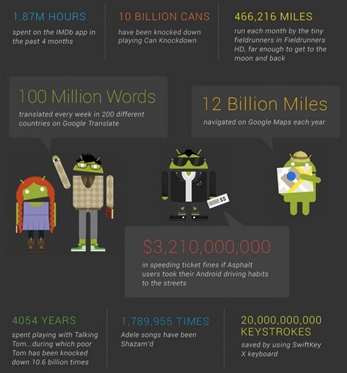 每日人均下載排名首五位中有四個都屬亞洲區,分別是首三名的南韓、香港、台灣和第五位的新加坡,而美國則排第四。雖然Google並沒有公佈實際各地的數字,但總體下載量在過去半年內激增40億,實在驚人。遊戲佔總下載的25.6%,其次的是娛樂類的12.2%和佔11.17%的工具類Apps。Android Market下載最繁忙的時段為星期日晚上9時,最疏落則是星期一清晨4時。