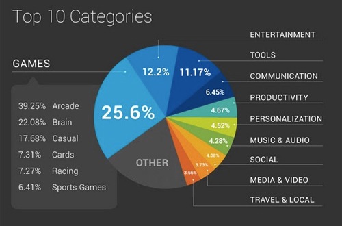 每日人均下載排名首五位中有四個都屬亞洲區,分別是首三名的南韓、香港、台灣和第五位的新加坡,而美國則排第四。雖然Google並沒有公佈實際各地的數字,但總體下載量在過去半年內激增40億,實在驚人。遊戲佔總下載的25.6%,其次的是娛樂類的12.2%和佔11.17%的工具類Apps。Android Market下載最繁忙的時段為星期日晚上9時,最疏落則是星期一清晨4時。
