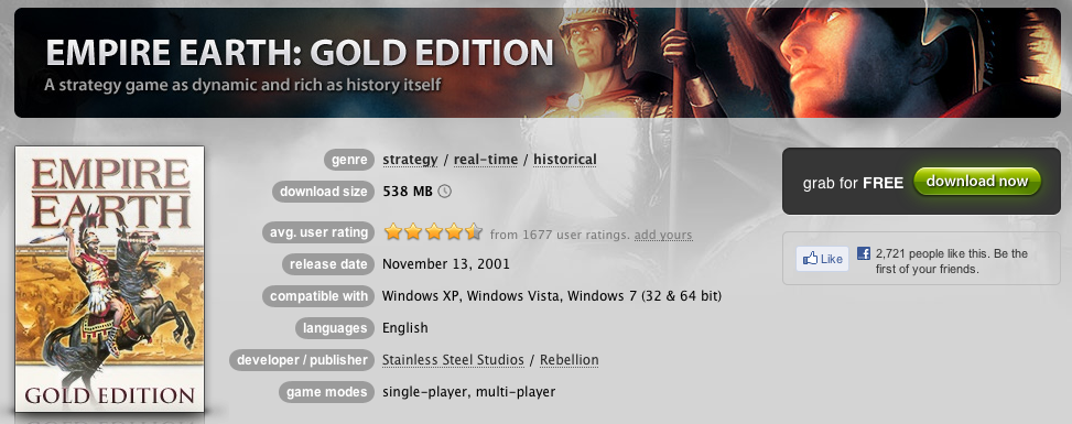 Empire Earth這款即時戰略遊戲,雖然有點舊,但也是一款頗為經典的即時戰略遊戲。最近,這Empire Earth和其擴充包,可以合法地免費下載,很是吸引。這次的限時免費活動,是由網上遊戲商店Good Old Games發起的。他們最近就是推廣反DRM行動,並順便宣傳一下這個有不少舊遊戲的平台,所以就推出今次的限時免費活動。這個平台上有不少的舊遊戲,以平價出售,現在還有半價優惠。不過無論如何,也是快點去下載Empire Earth為上。 GOG下載網站