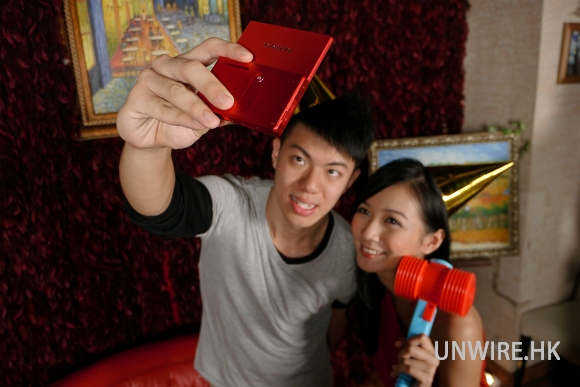 利用 MV 800 的 Flip Mon 自拍,還是『高抄』好,記得用三七面,面形看起來自然會更加纖瘦。如果跟男生合照的話,由他們拿機操作,因為他們手長一點,拍攝時出現的變形問題也沒那麼厲害。另外,Party 環境大都在室內,往往都會有光源不足的問題,所以拍攝時宜找個可以面向光源的位置(例如射燈前、窗邊),可減少因光源不足而出現的雜訊和手震問題。