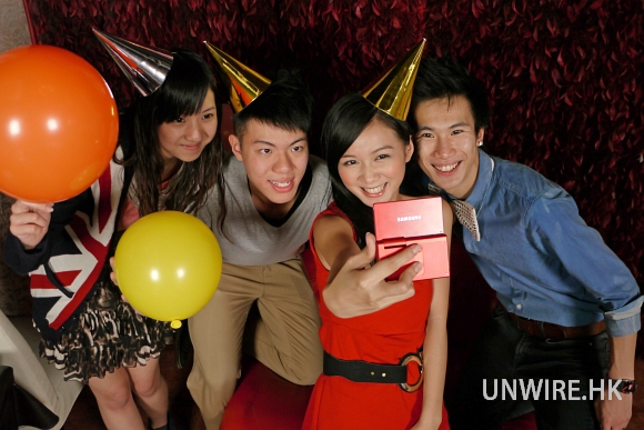利用 MV 800 的 Flip Mon 自拍,還是『高抄』好,記得用三七面,面形看起來自然會更加纖瘦。如果跟男生合照的話,由他們拿機操作,因為他們手長一點,拍攝時出現的變形問題也沒那麼厲害。另外,Party 環境大都在室內,往往都會有光源不足的問題,所以拍攝時宜找個可以面向光源的位置(例如射燈前、窗邊),可減少因光源不足而出現的雜訊和手震問題。
