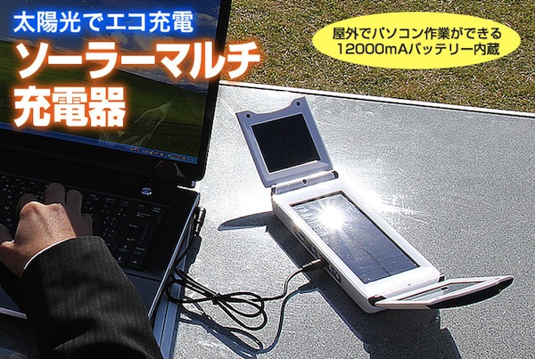 剛在日本開售的山陽「EEA-SL-SNC25」太陽能充電器,充電器有3塊太陽能收集板,可以180度打開吸收陽光,內部電池蓄電量為12,000mAh。配備有5組輸出,包括USB 5.5V、11.1V、16V、19V及24V,連同一系列不同的插頭,為手提電腦充電亦冇難度。充電器有有LED顯示剩餘電量,如果唔怕電費貴,利用一般交流電源(AC)為充電器充電亦可。