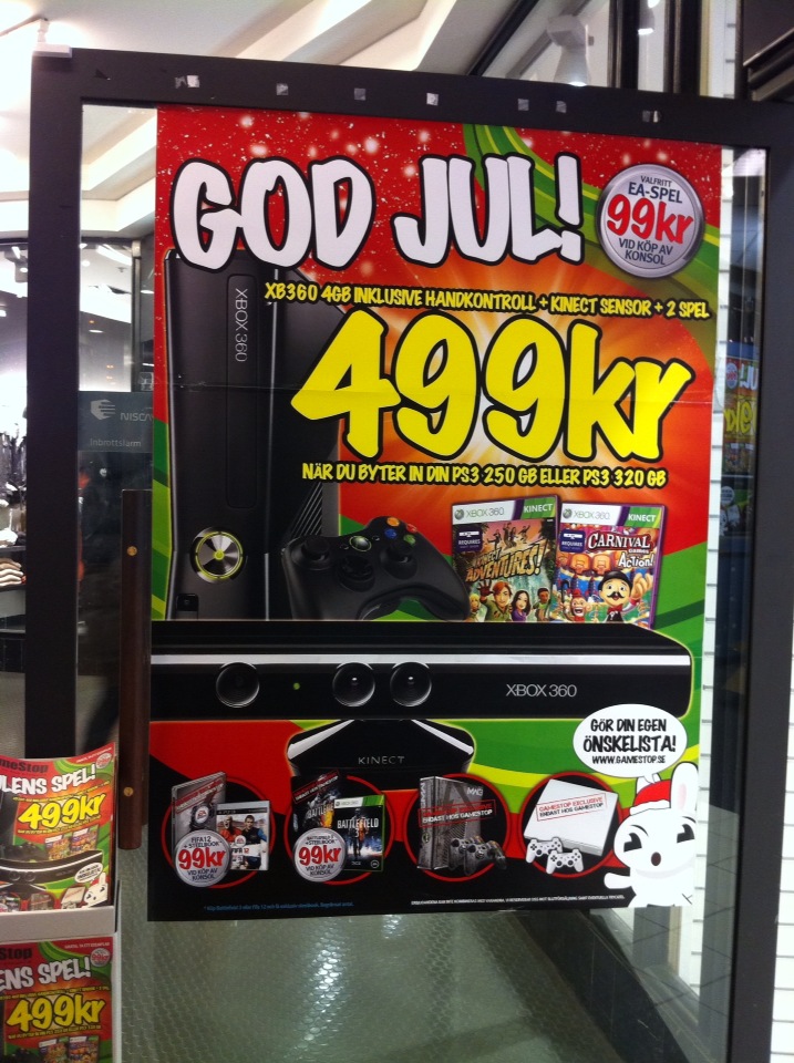究竟在瑞典買Game是怎樣的呢?先對比一下賣Game的途徑,在香港要買Game,有人會去HK Records、HMV、玩具反斗城,亦有人會去信和、188,甚至街坊經營小店;但瑞典呢,幾乎沒有賣Game的小店,要買Game,去幾間大型電器連鎖店(想像一下他們是豐記、百記)就可以了,一般最流行的都買得到。其次就是專賣遊戲產品的連鎖店GameStop,裡面有齊所有主機、遊戲、配件,就連相關的精品都有,但若果住在偏遠的鄉郊或懶惰的人,還可以選擇網購,物品會送到家門。