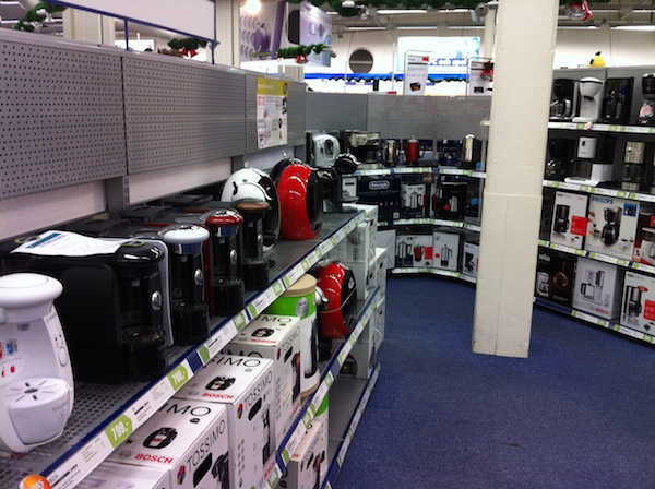 Xbox 360、PS3 Move、Wii、任天堂3DS隨便試玩,部分更連接TV Wall,試玩都特別興奮。 三防的Android,除了Motorola Defy,還有Samsung Galaxy Xcover,香港會上市嗎? 咖啡機的款式多,是瑞典電器連鎖店的特色之一。 前面說過「貨很多」,其實香港作為數碼和電子產品品牌看重的地方,差不多所有最新最好的產品,香港都不缺;瑞典其實也不輸蝕,部份香港市場可能不看好的,例如Nokia N9、Samsung Galaxy Xcover,都可以買到。另一樣十分獨特的,就是咖啡機的市場很大,因為瑞典人很愛飲咖啡,各色各樣咖啡機都有。