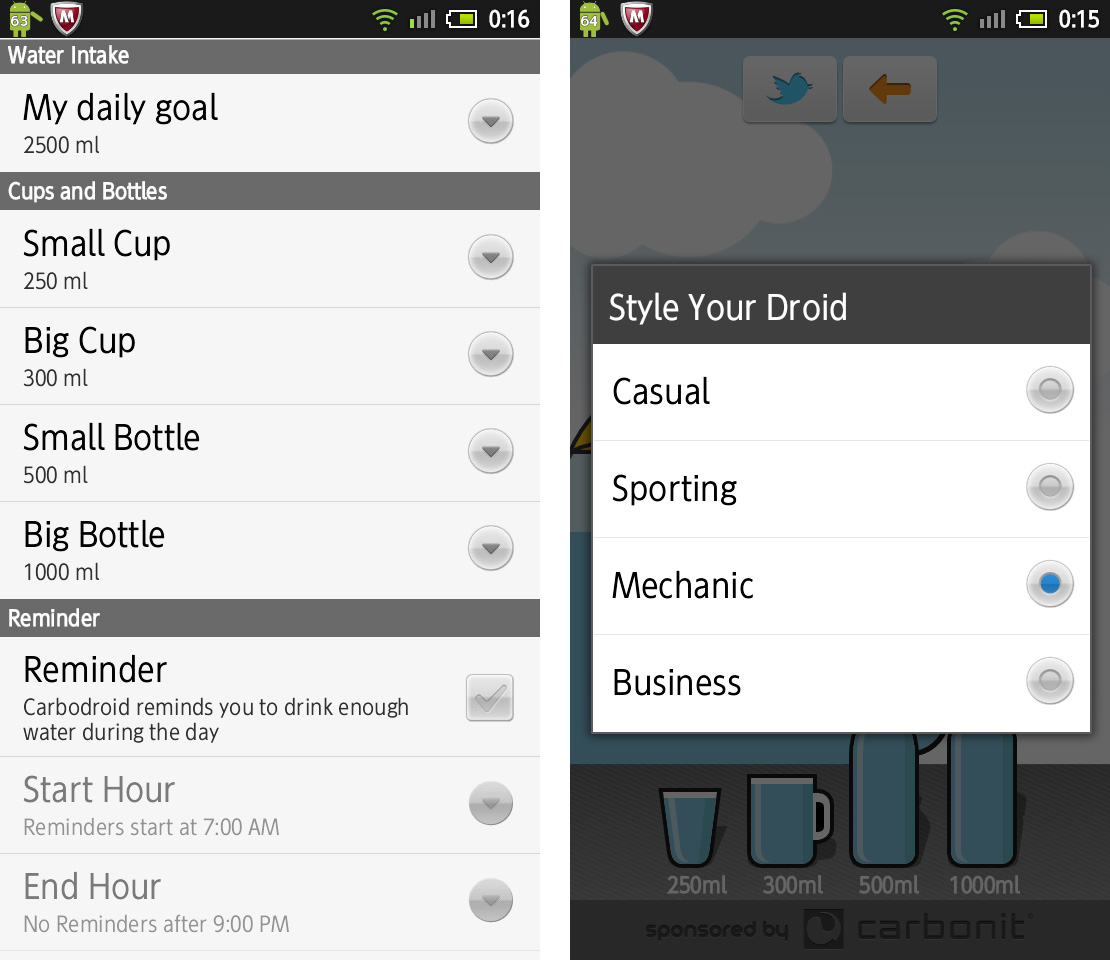設定方面你可以按你的需要輸入每日飲水目標,也可按你自己的杯子調節在 droid 前面的水樽。Carbodroid 還有溫馨提示,彈出來提醒你定時定候飲水,不怕顧住工作而忘記了。近日新版本還可以替 Carbodroid 換衫,可以配合你自己的身份,哈哈!