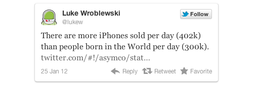 在剛剛公佈的Apple財政報告中,iPhone在2012年財政年度的首季,售出了3704萬部,十分厲害,但實際上有多厲害呢?最近設計師Luke Wroblewski說出了驚人的事實:每天售出的iPhone竟然比每天出生的嬰兒為多。