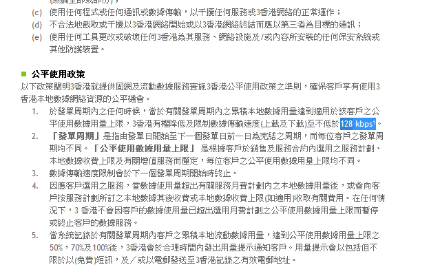 今天是電訊管理官實行公平使用政策守則的首天,就連以往一直標榜不設限使用的 3 香港,亦在今天悄悄取消無限數據計劃。一般用戶最多用 3GB,而如果出機的話就可以用每月 5GB 數據。而用爆數據後不會用不到,而只是跟隨電管局的指引限速,上限為每秒 128kbps。雖然變得較慢,但緊急要上網一樣有得用。