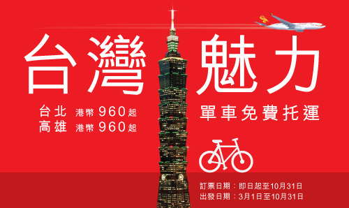 去旅行除了帶 iPad 及手機外,還可以帶埋你心愛的戰車!港人單車熱潮越來越旺, 可惜香港地細,路線發揮有限。盛行單車文化的台灣,向來是單車愛好者的夢想地。最近香港航空便推出台北 Package,更提供免費單車托運! 詳情