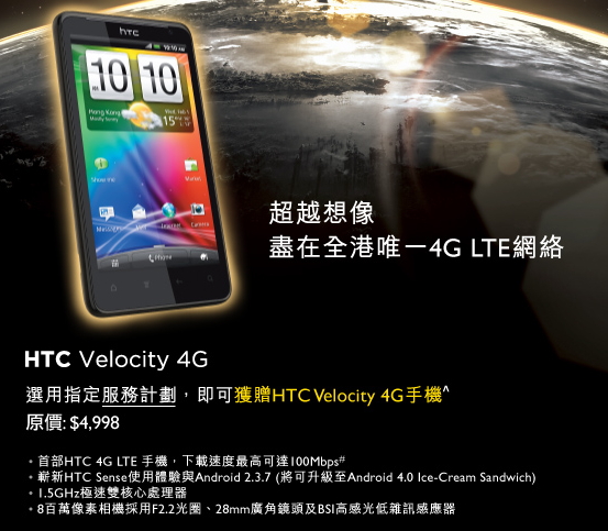 CSL 1010 搭配 HTC Velocity 4G 智能手機計劃出台,跟現有的 3G 上台出機一樣。其「1O1O「樂無憂」服務計劃」可以 $439 月費獲得無限上網,合約期為 12 個月。用戶亦可以自帶 4G 手機上台,但需簽 24 個月合約,才可享有 $339 月費無限數據服務。而這兩個計劃,公平用量亦是 5GB,用量超過後網絡優先次序會被調低。發言人表示,由於現時 4G 使用者用戶較少,所以被調低優先度的機會暫時相對較低。