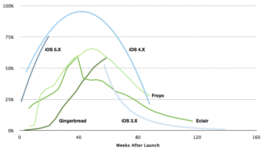 最近有研究指出,Android的版本散亂問題依然嚴重,相對起iOS的升級,Android的升級由於要等待廠商推出,而且有不少的Android機款未能得到最新版本的系統,會立刻轉用新系統的用家不算很多。從上圖中也能看到,iOS用家轉用新版本的速度比Android高很多。有開發者表示,支援到iOS 4已是非常安全,但Android的話就算想用到最新的功能,但又要照顧大量舊版本的用家,實在難以取捨。這個問題也許是Android的結構性問題,不是一時三刻能夠解決。