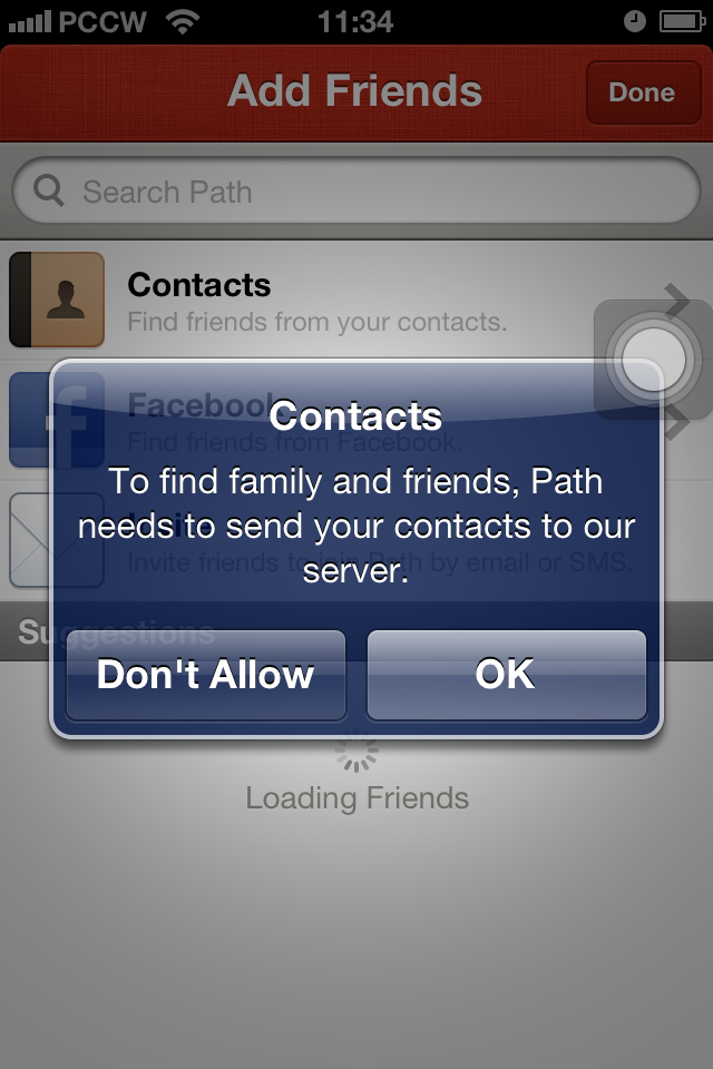 手機電話簿對於個人來說是重要的資料之餘,對於大公司來說,這些私人資料也是擴充業務的重要工具之一。最近知名社交 App – Path,就被揭發會自動將手機內的電話簿上傳至伺服器,其中 iOS 版本更是在完全沒有用家授權的條件下,暗地裡偷傳資料。雖然 Path 辯稱這是務求令系統更快確認哪些人是用家的親友,但無疑是侵犯私隱的行徑。隨後,不少知名 Apps,包括:Gowalla、Facebook、Foodspotting、Foursquare、Instagram、Twitter 和 Yelp 也發覺有類似行徑,亦會暗傳電話簿資料至伺服器,構成私隱危機。