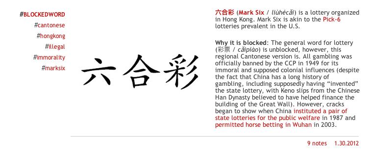 這網站是以英語解釋不同禁語的意思和被禁的原因,十分有趣。到現時為止,列出了219個禁字,當中有些是不再被禁,只是在某段時間曾經成為過禁語而已。稍為看看,才發現原來草泥馬不算禁語,但六合彩也算是禁語,實在耐人尋味。禁語大多與人物、色情、政治等有關,如果想避免發言被河蟹,或者想了解國情的話,也可以去看看這個資料豐富的網站。