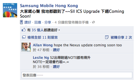相信各位 Galaxy S II 的用家,應該等待香港 Samsung 推出 Android 4.0 升級包等到差不多要發火了,但剛剛 Samsung 在官方 Facebook 表示,香港的 GS2 ICS 升級將會在下星期開始,大概這消息終於可能為大家「下火」了吧!至於 GS2 升級 ICS 後的表現如何?小編將會在可以升級後親身測試,並向大家報告,敬請期待!
