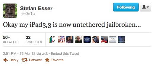著名 Jailbreak 團隊 Dev Team 的成員 MuscleNerd,在新 iPad 開賣大約半日左右,就已經對外宣稱已經成為完美 Jailbreak 帶有 iOS 5.1 的新 iPad,而且上載了一張 Jailbreak 後使用 Cydia 的相片。另一名著名 Hacker i0n1c 亦於其 Twitter 上發布了自己已經成功替新 iPad 進行了 Untethered 的 Jailbreak。雖然未知推出日期,但足以證明 Jailbreak 新 iPad 離我們不是太遠!