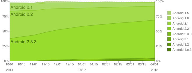 現在最多Android裝置使用的版本,是Android 2.3 Gingerbread,佔63.7%,而更舊的Android 2.2 Froyo依然有23.1%的裝置在使用。這情況很多時候是因為廠商不願意投放資源,為舊款手機開發系統更新所致。相對於iOS裝置的更新速度,Android的版本分散情況嚴重得多,開發者在加入新功能時,往往要考慮向下兼容的問題,成為發展的瓶頸。未來Google要怎樣去解決這個問題,將會成為一個主要的議題吧。