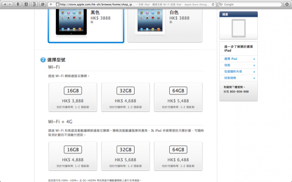而今日,全新 iPad Wi-Fi + 4G 版開售之際,Apple 終於在 Online Store 開始銷售全新 iPad。現全機款顯示均有貨,每位顧客限購兩台,發貨時間為 1-2 個星期。Wi-Fi 版 16GB HKD$3,888,32GB $4,688,64GB $5,488;Wi-Fi + 4G 版 16GB 為 $4,888,32GB $5,688,64GB $6,488。