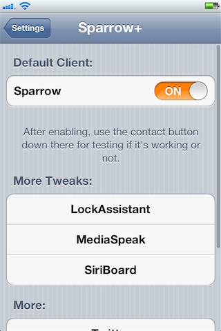 Sparrow+ 是一款免費的小工具,現已登陸 Cydia 的 BigBoss 源。安裝後 Sparrow 即可擁有推送通知功能。更重要的是,它還可以將 Sparrow 設定為 iPhone 的默認電郵程式。也即是在設定後,點擊電郵地址,iPhone 將開啓 Sparrow 程式而不是 iOS 自帶的 Mail 程式。確實不錯。