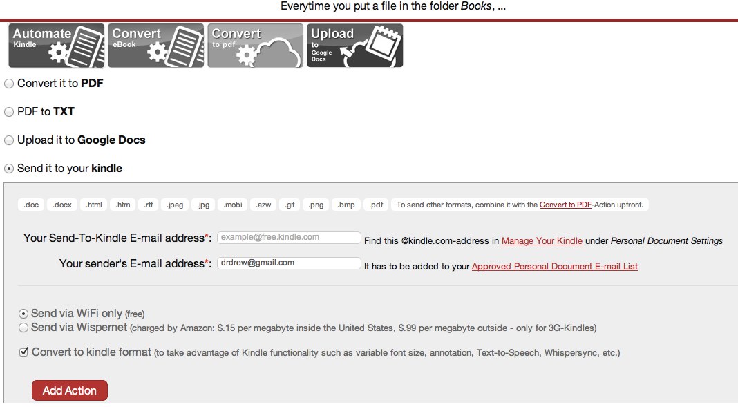 當你將自己的 Google Drive 帳號跟 GDrive Automator 連結起來後,你就可以建立智能文件夾。 上圖例子就新增了一個叫做「Books」 的文件夾,每次只要在 Books 裡放入 PDF 文件,檔案就會自動轉成適合 Kindle 讀取的格式,並自動傳送到你的Kindle 上。