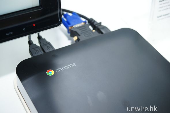 Chromebox機身就像Mac Mini的黑色版本,沉實穩重。內裡採用Intel Celeron雙核心處理器,內建HD Graphics 3000,配備16GB SSD及4GB記憶體,802.11b/g/n、GbE及Bluetooth 3.0網絡,輸出則為DVI及兩組DisplayPort,定價$359美金,已在美國發售,針對教育用途。