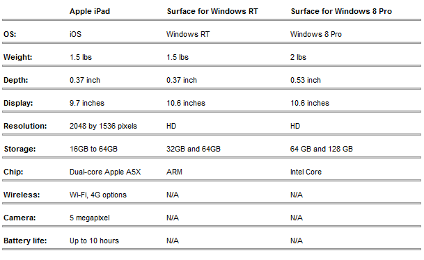 Surface平板採用的是10.6吋屏幕設計,但就因應ARM及x86兩個不同的硬件平台而配搭Windows RT或Windows 8 Pro。Windows RT版本的厚度與iPad一樣,只有9.3mm,重量為676g,內建了microSD、USB 2.0、microHDMI、2×2 MIMO天線及前後高清鏡頭,採用31.5Wh電池。Windows RT版本雖然未能安裝現有的Windows應用軟件,但備有Office Home & Student 2013 RT版本,提供Office檔案讀寫能力。