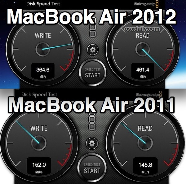 網上就有為新的13吋MacBook Air 128GB型號進行了SSD新舊對比測試,包括了2010年及2011年版本。相比起上一代,讀寫速度由145MB/s及152MB/s提升至461MB/s及364MB/s,無論是讀寫均大幅提升,其中讀取速度更快達三倍,令應用起動時間更為快速。雖然461MB/s的讀取效能與現時PC上的高達550MB/s速度仍然有差距,但實際上只是跑分上的數字分別,真正用起上來是差不多的。