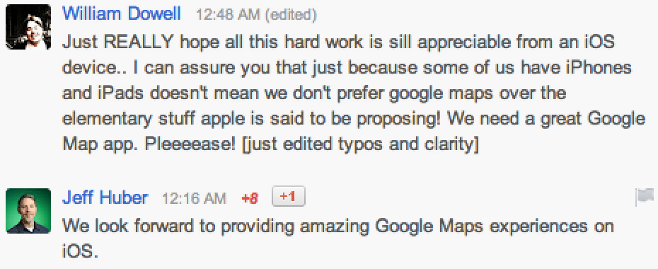 早前Apple就宣佈於iOS 6時棄用Google地圖,改用自家地圖,然而用戶的回響不少希望保留Google地圖,在本週Google I/O活動開始前,Google高層Jeff Huber在Google+的留言回應,表示『我們期待著在iOS上提供令人驚嘆的Google地圖體驗』,似乎好戲還在後頭。