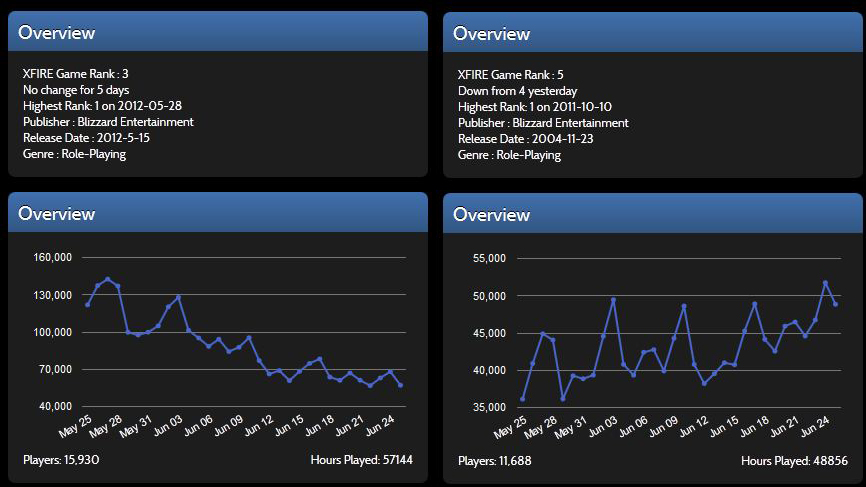 被視為近十年來的經典大作Diablo 3,自推出以來玩家對其遊戲性好壞參半,任務少難度飄忽,改版後更大幅降低可玩性,可得到的金幣數目大減,但維修費用貴上數倍,令不少玩家放棄。在最新的統計數字上看到,Diablo 3初推出時玩家所花的遊戲時間曾高達142,620小時,之後不斷下滑,到了6月13至14日的1.0.3改版後跌到60,883小時新低,其後回升了數天至日前只有57,189小時,總玩家為15,930人,即每人每日只花約3.59小時在此遊戲上。相比起另一經典大作World of WarCraft,推出近八年仍然受歡迎。在5月25日時雖然只有36,129小時總遊戲時間,但到了日前已回升至48,857小時,以總共11,688名玩家去計算,每名玩家所花時間為4.18小時,比起Diablo 3要好得多。以下左邊圖表是Diablo 3,大家可以自行比較。