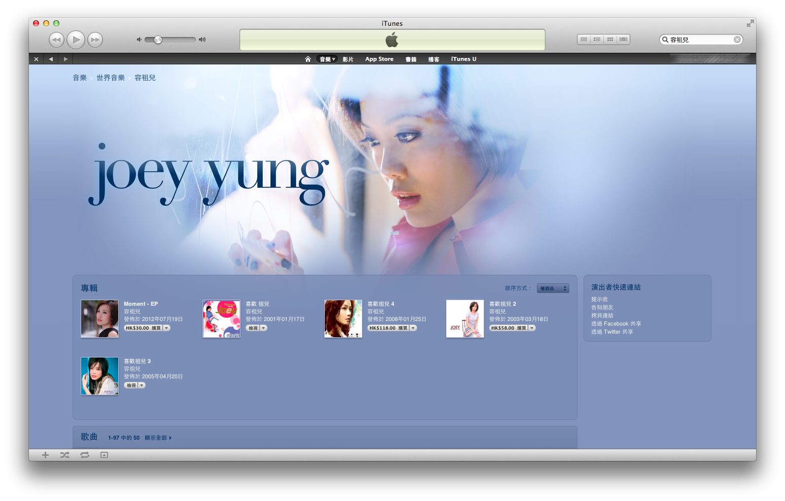 一直以來Apple的香港iTunes Store只售賣Apps跟遊戲,並沒有音樂和影片發售,但這個情況終於改寫,香港的iTunes Store開始發售音樂和影片,而容祖兒的國語大碟《Moment》本應7月中上市,卻可在iTunes Store搶先購買下載。
