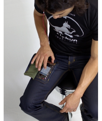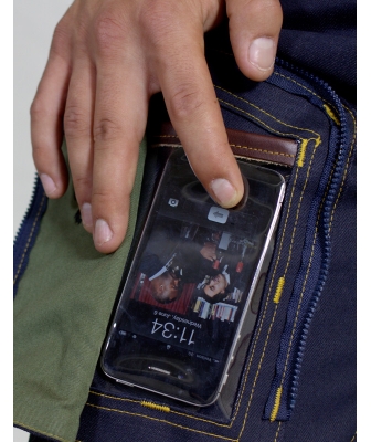 這條名為「DELTA415 Wearcom」的牛仔褲,由Alphyn研發,在右前方褲袋位置有一塊可揭開的布掩,下面則有一塊特製耐磨的聚合物薄膜,讓用戶可以將智能手機放在褲袋,毋須取出就可以使用。是否實用就見仁見智,但「DELTA415 Wearcom」的特製專利褲袋只可容納5吋以下的手機,以香港Galaxy Note用戶這麼多,就肯定不受歡迎。