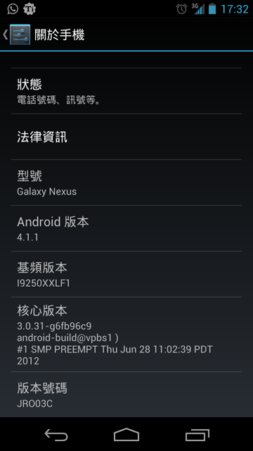 在Galaxy Nexus上,升級後的Android 4.1.1為build JRO03C,與Nexus 7的是一樣,在界面、速度及以Widgets等多方面也有作出改善,進一步作出系統優化。據知Android 4.1.1已經不能夠在Google Play上找到Adobe Flash Player可供下載,除此之外未有資料知道與Android 4.1的分別。已Root機的用家也要留意,升級後需要再次Root機,否則部分需要Root權限的應用將會不能夠運作。另外要注意的是港行Galaxy Nexus用家並未受惠,還要留待香港Samsung官方日後公布。
