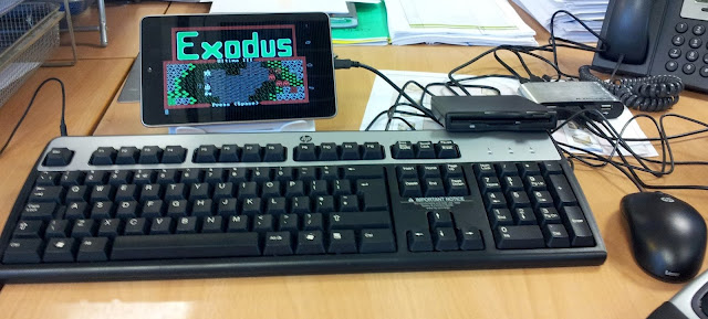 Nexus 7上沒有SD卡插槽,也沒有後置鏡頭,這作為一個減少成本的設計,也無損發燒友們把它改造一番的興致。上圖的這個配備,只是把Nexus 7 root了,裝進DOSbox,再用USB連接磁碟機、鍵盤和滑鼠,就把這最新型的Tablet回到過去,直接從磁碟機開啓Ultima,享受經典遊戲的樂趣。這也許就是Android裝置好玩之處吧。